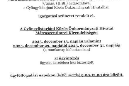 Ezúton értesítjük Önöket, hogy az orvosi rendelés Mátraszentimrén, az Arany János u. 7. szám alatt az alábbi időben történik: