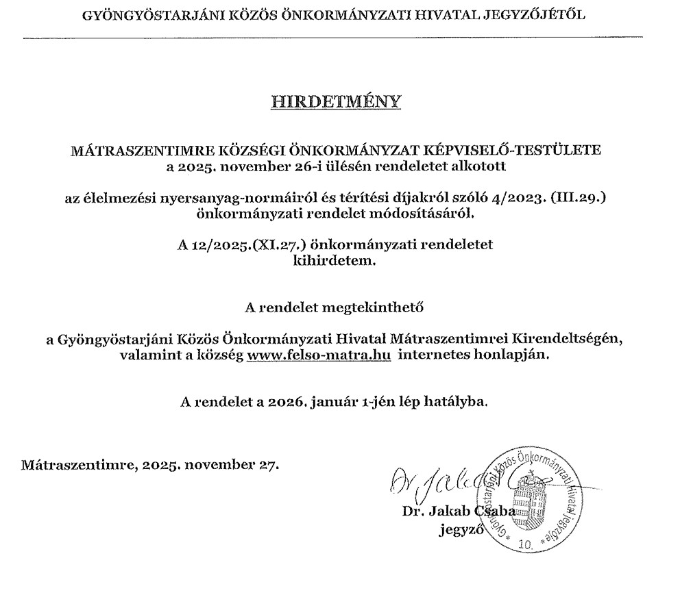 Hirdetmény az élelmezési nyersanyag-normáiról és a térítési díjakról szóló rendelet módosításáról / 2025.12.10. admin küldte be 10 December 2025 időpontban