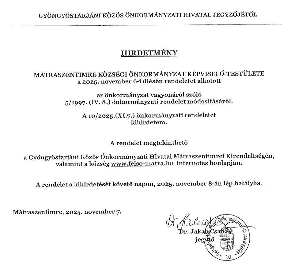 Hirdetmény az önkormányzat vagyonáról szóló rendelet módosításáról / 2025.12.10. admin küldte be 10 December 2025 időpontban