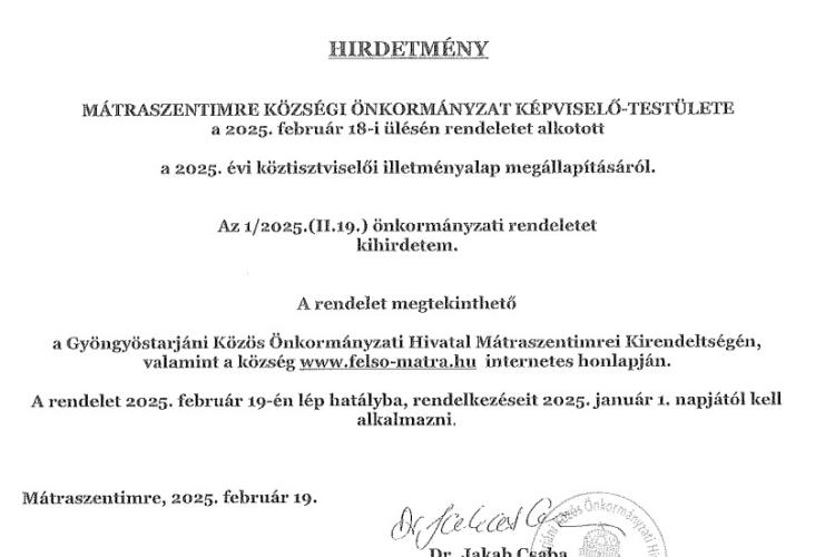 Hirdetmény - 1 2025. (II.19.) 2025. évi köztisztviselői illetményalap megállapításáról