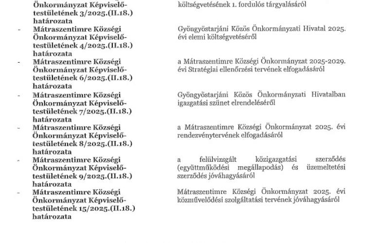 Hirdetmény a Mátraszentimrei Községi Önkormányzat 2025. évi költségvetéséről