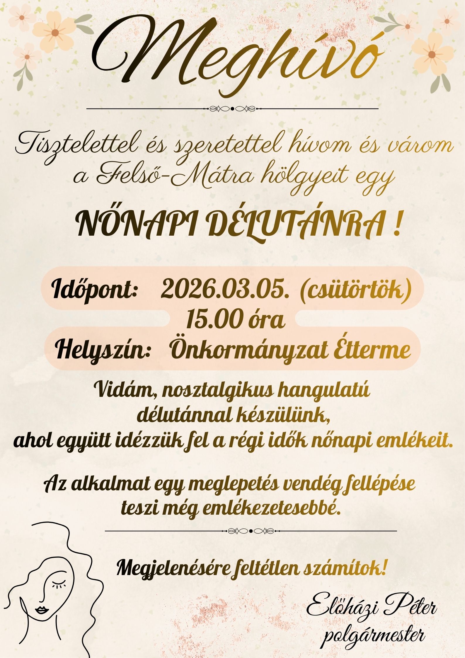Meghívó Nőnapi délutánra Meghívók / 2026.02.28. admin küldte be 28 February 2026 időpontban Meghívó Nőnapi délutánra