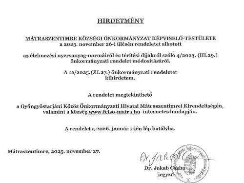 Hirdetmény az élelmezési nyersanyag-normáiról és a térítési díjakról szóló rendelet módosításáról