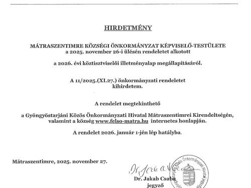 Hirdetmény a 2026. évi köztisztviselői illetményalap megállapításáról
