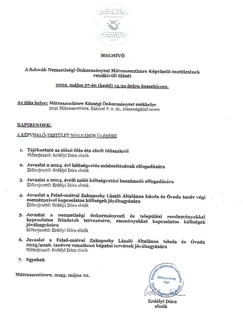 Meghívó Szlovák Nemzetiségi Önkormányzat 2025. 05. 27-i rendkívüli képviselő-testületi ülésére