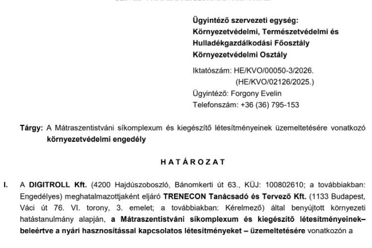 Mátraszentistváni síkomplexum környezetvédelmi engedélye